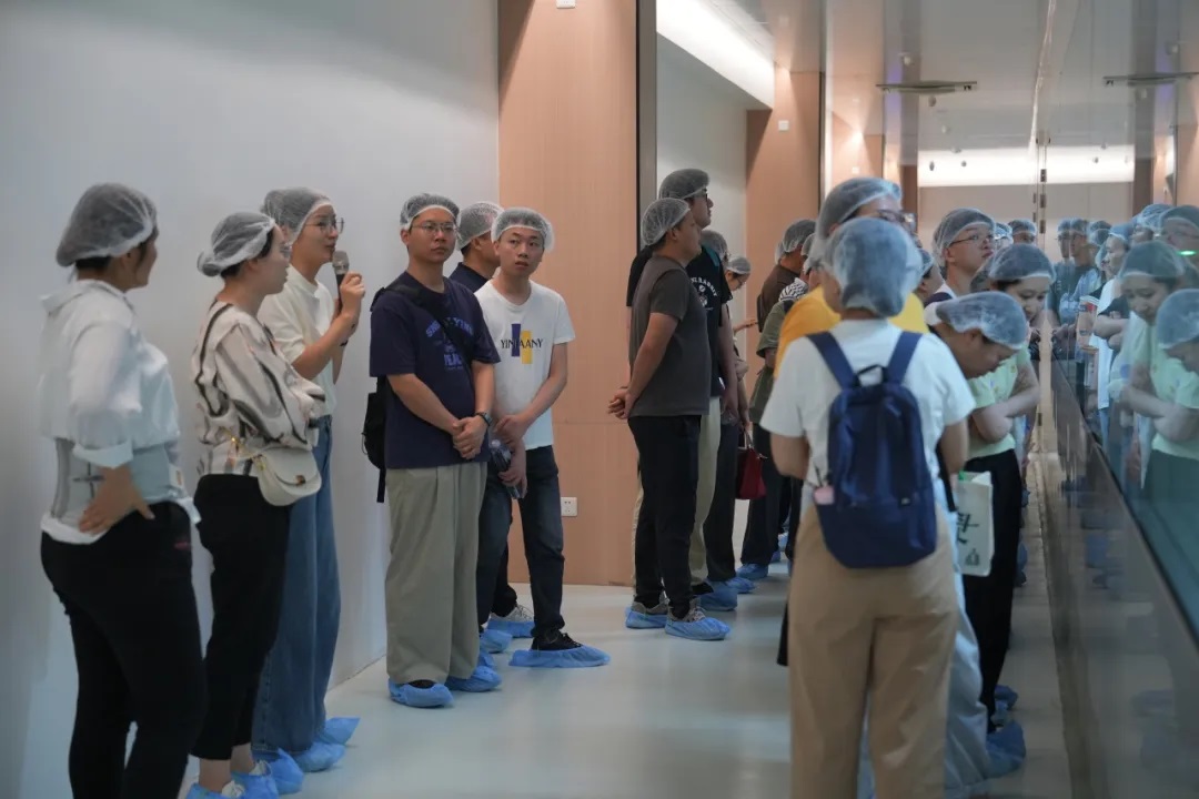 活動伊始,大家穿戴好一次性帽子和鞋套進入了車間,一股淡淡的甜香撲鼻而來,那是糕點烘焙后散發出的誘人香氣。大家沿著整潔的生產線參觀,看到工人們身著統一的工作服,手法熟練地進行著各道工序。通過生產負責人的講解,大家了解了合和圓緣工廠的材料使用、制作工藝、冷鏈運輸等各流程的工作規范和要求,也見微知著地感受到了合和圓緣細節體現的匠人追求和專業素養。