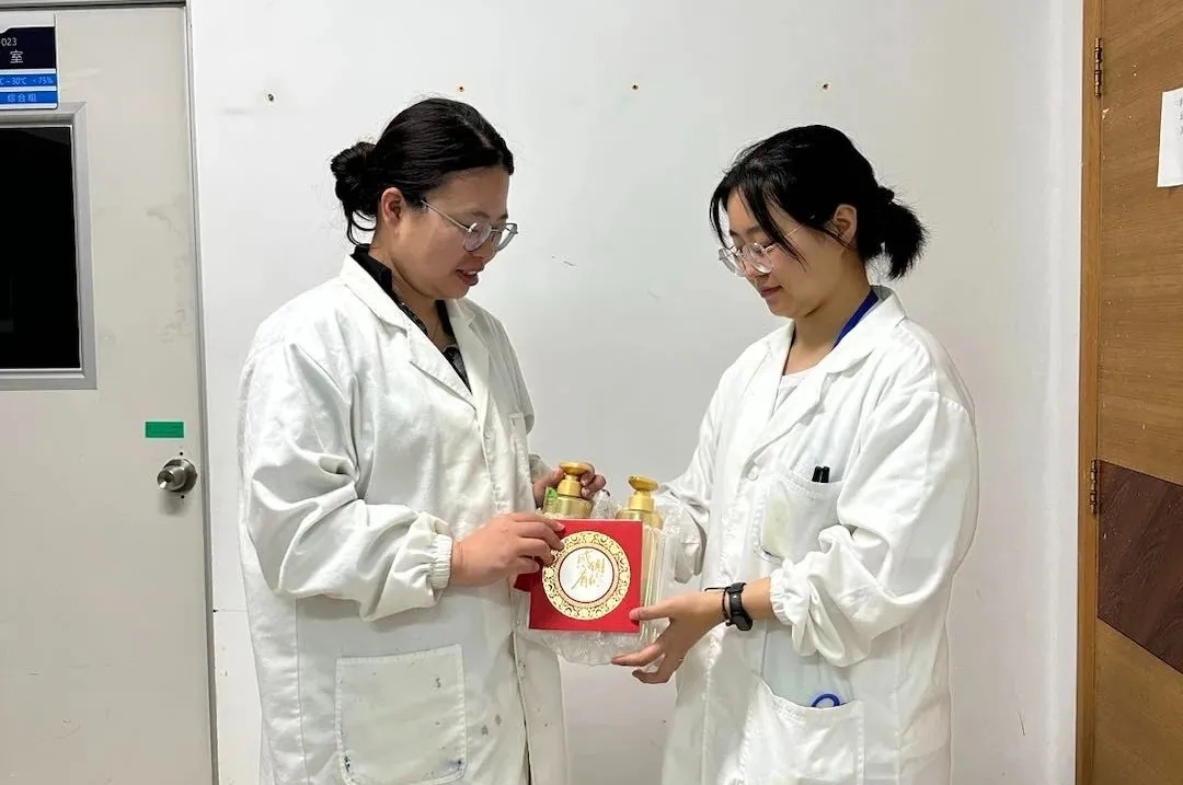 面對每一項任務,她都敢于挑戰、不畏困難。在成品組的檢測項目中,她發現對照品物質在室溫下易融化導致稱稱樣結果不準確的問題,經過幾次檢測該產品后,她積極思考如何有效控溫并提高稱量速度。經過一番思索,她嘗試使用過濾膜塑料盒加水制作簡易“冷凍倉”,在稱量過程中幫助產品有效保溫,保證對照品處于冷凍狀態。在經過多次使用后,發現該方式對稱量對照品速度有顯著提升,同時減少了對照品使用成本。