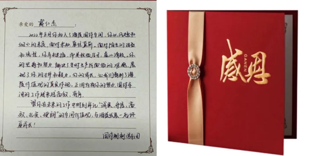 海陵衷心對他們的付出表示感謝,并為其準備了感恩卡和禮物,直屬領導“驚喜出現”,將手寫感謝卡和禮物交給他們!