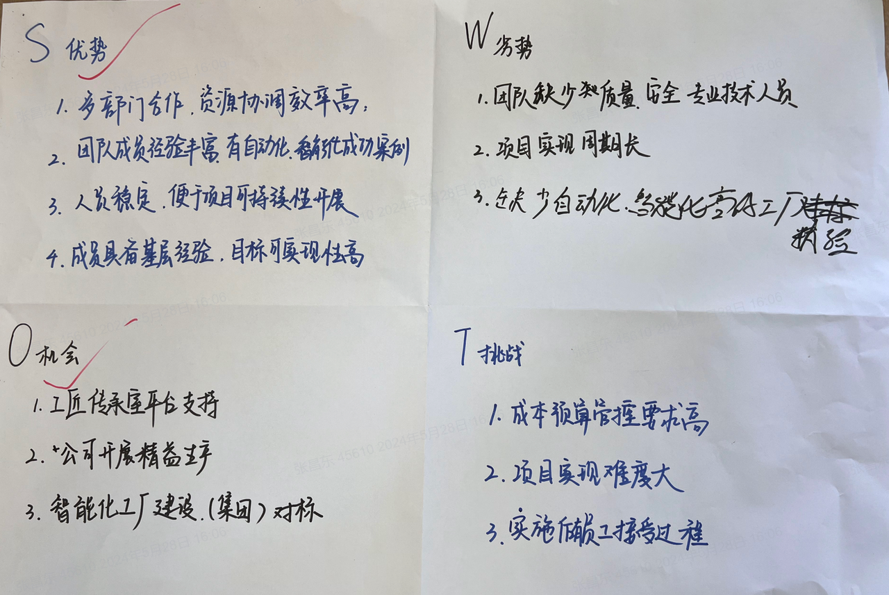 5月28日,海陵8個工匠傳承室參與了2024-2025年度的行動學習共創(chuàng)會,各自明確了本傳承室新一年度目標,碰撞出思維火花,共創(chuàng)分解指標。其中王志鵬傳承室深知,在快速變化的工業(yè)4.0時代,自動化與智能化是提升生產(chǎn)效率、保證產(chǎn)品質量的關鍵。因此,他們將目光聚焦于未來,確立了打造自動化智能車間的愿景。這一愿景不僅承載著對技術進步的追求,更蘊含著對工匠精神的傳承與創(chuàng)新。基于愿景,王志鵬傳承室設置了三個關鍵目標,進行了SWOT分析與策略制定。