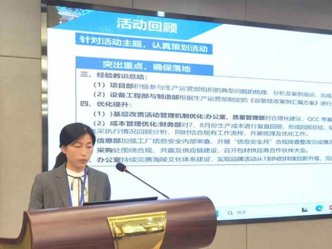 馮部長對第三十六次“質量月”活動進行總結發言。圍繞本次活動內容、不足與改進以及承上啟下內容進行展開:1)在總結中,她通過正反面案例展示活動期間各部門的亮點工作和不足;2)她強調要強化質量月內容與標準模板的解讀,保證材料輸出的質量;3)最后,她針對質量管理部制定的崗位“放心人”選拔方案進行解讀,希望大生產系統各部門能夠選拔更多的放心人,挖掘新生力量,推動企業不斷成長。