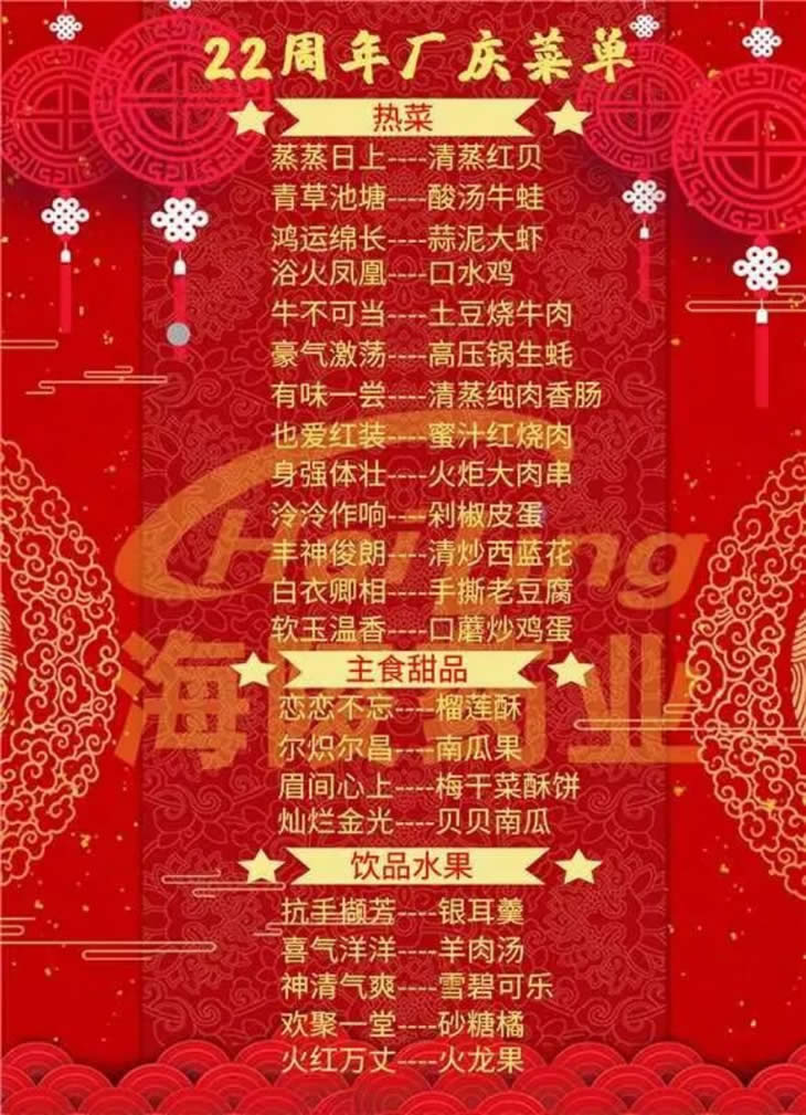 二十二年!是一道歷史印跡的長度!是揚帆逐夢,轉型發展的高度!海陵食堂準備了豐盛的廠慶自助餐活動,邀請大家一起共享這份喜悅,見證奮進者的光芒~