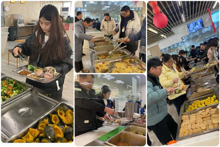 菜名吉利、美味豐盛的各色美食次序排開。大家一時難以抉擇,紛紛表示“我全都要”。餐盤中,海鮮肉食、清爽鮮蔬、精美糕點、甜蜜水果很快摞起一座高高的小山?!靶虏松峡?!”司務長一聲吆喝,又引得無數圍觀,好不熱鬧。